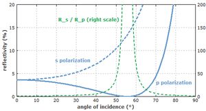 Brewster's angle[1] is the angle under which p-polarized indicent light is almost completely transmitted. In the figure[2] to the right, you can see that an air/silica interface has a reflectivity of zero for p-polarized light at ~56°. Brewster's angle is dependent on the ratio between refractive indeces, which in turn are dependent on the wavelength of the light.