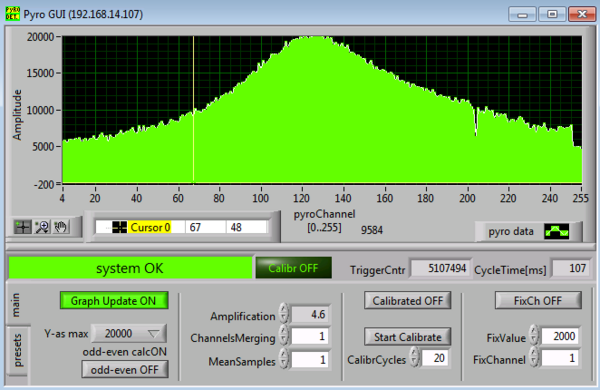 - CalibrCycleON: switched on will try to make an offset array of each channel to zero it. When done the switch will turn gray again.