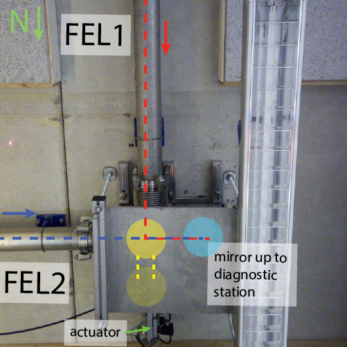 A mirror selects whether FEL1 or FEL2 is transmissed via the FELIX optical transport system. The mirror hangs from the ceiling of the vault, precisely below the FELIX diagnostic station. The mirror is remotely controlled via ethernet (ETH484-11).