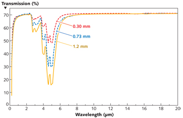 Absorption of diamond as a function of thickness from 0-20 µm. source: https://www.laserfocusworld.com/articles/print/volume-49/issue-11/features/mid-infrared-optics-cvd-diamond-ir-optics-enable-euv-lithography.html