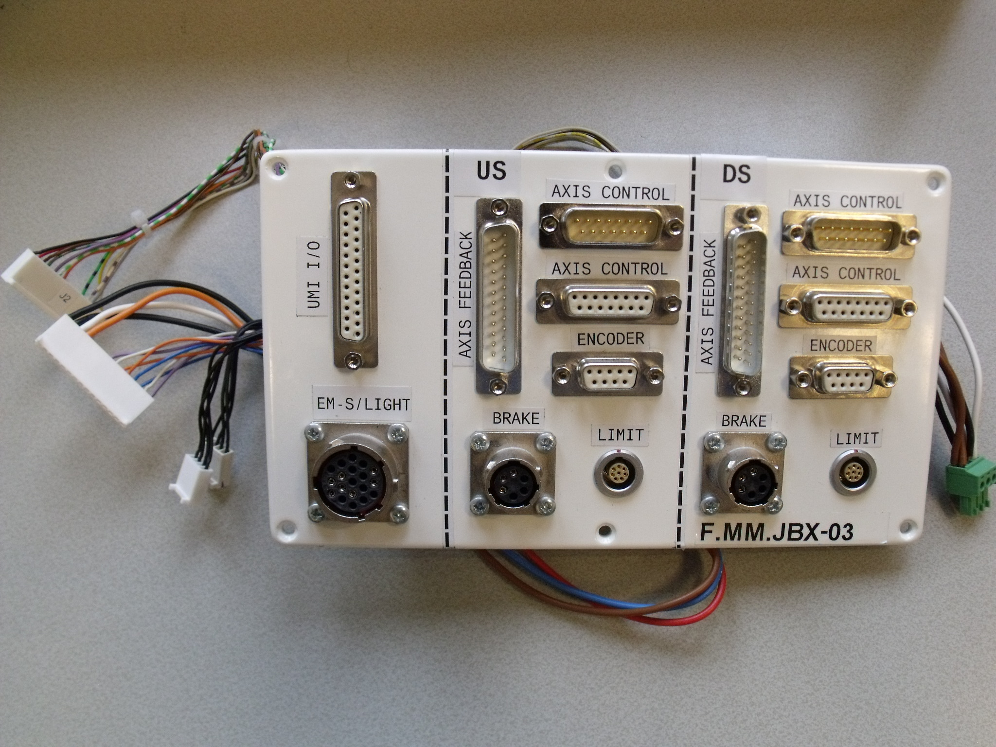 FLARE undulator junction box front showing all connectors