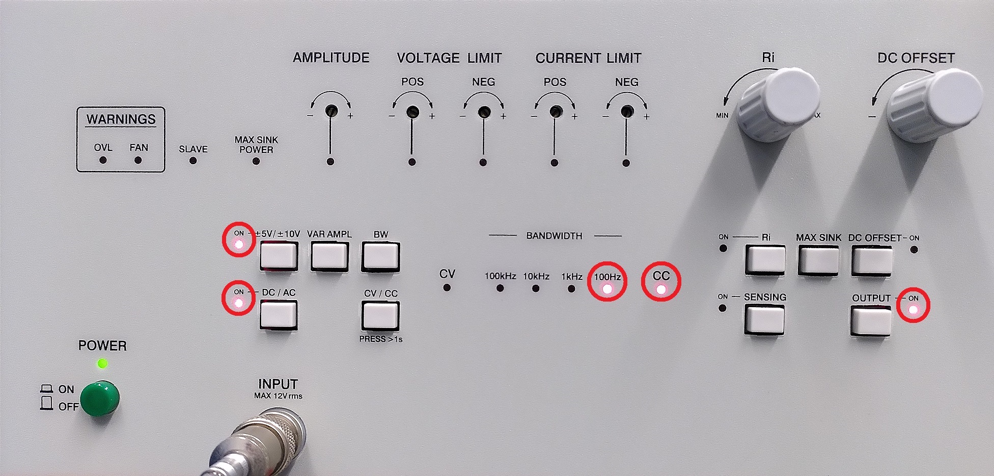This picture shows the right settings for using the Toellner 7610-60 4-quadrant power supplies.