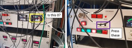 1. Check the current of the electron gun – it will (if this is indeed the fault) be 0A. Under the label “Crowbarâ€, there are two black buttons. Press both of these simultaneously, and the current should ramp back up.