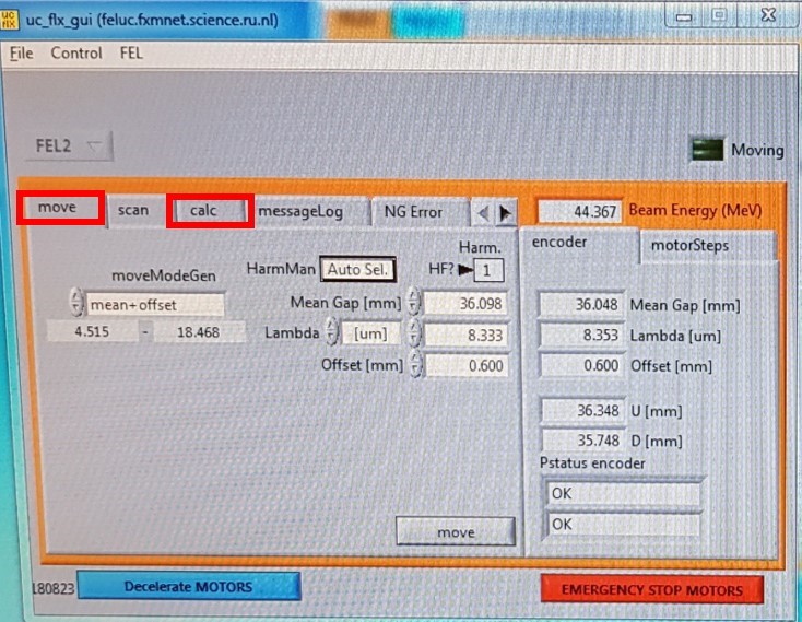Set the beam energy in MeV. In the window “uc_flx_guiâ€, go to “calcâ€, “enter†and “moveâ€. Set “Mean Gap†to 35 mm (this makes the lasing easier to find at first). Common ranges can be found at FEL2 page.