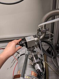 2. Make sure the backing pumps are on and the pump valves are open (see picture). The backing pumps should automatically turn on when the power comes back and they were not turned off.